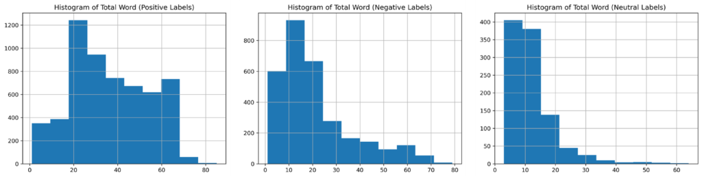The graph above shows that positive labels dominate with data containing a total of 20 words, totaling 1200 data points. Negative labels dominate with data containing 10-15 words, totaling 800-900 data points. Neutral labels dominate with data containing 1-10 words, totaling 400 data points.