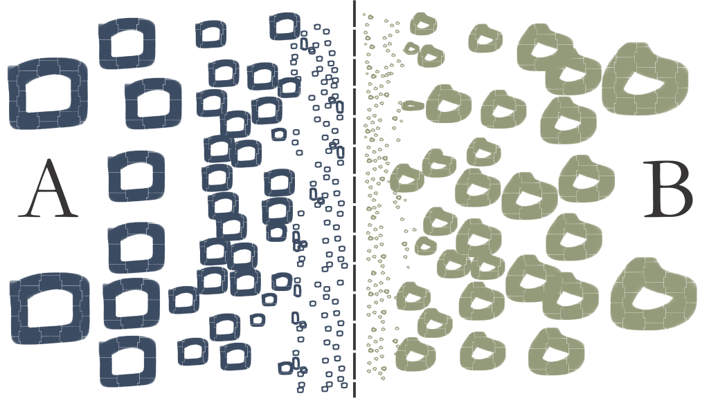 To make it easier to understand, I’ve created a visualization resembling an American football field. Now imagine that you, as the one offering the new product, are represented as A, while the potential customer is B. You and the potential buyer are on opposite sides of the field. The squares represent the belief that your product is worth buying, while the circles represent the potential buyer’s belief. The larger the visual element, the stronger the person’s conviction. The center is the neutral zone where both parties are not particularly sensitive to the topic.