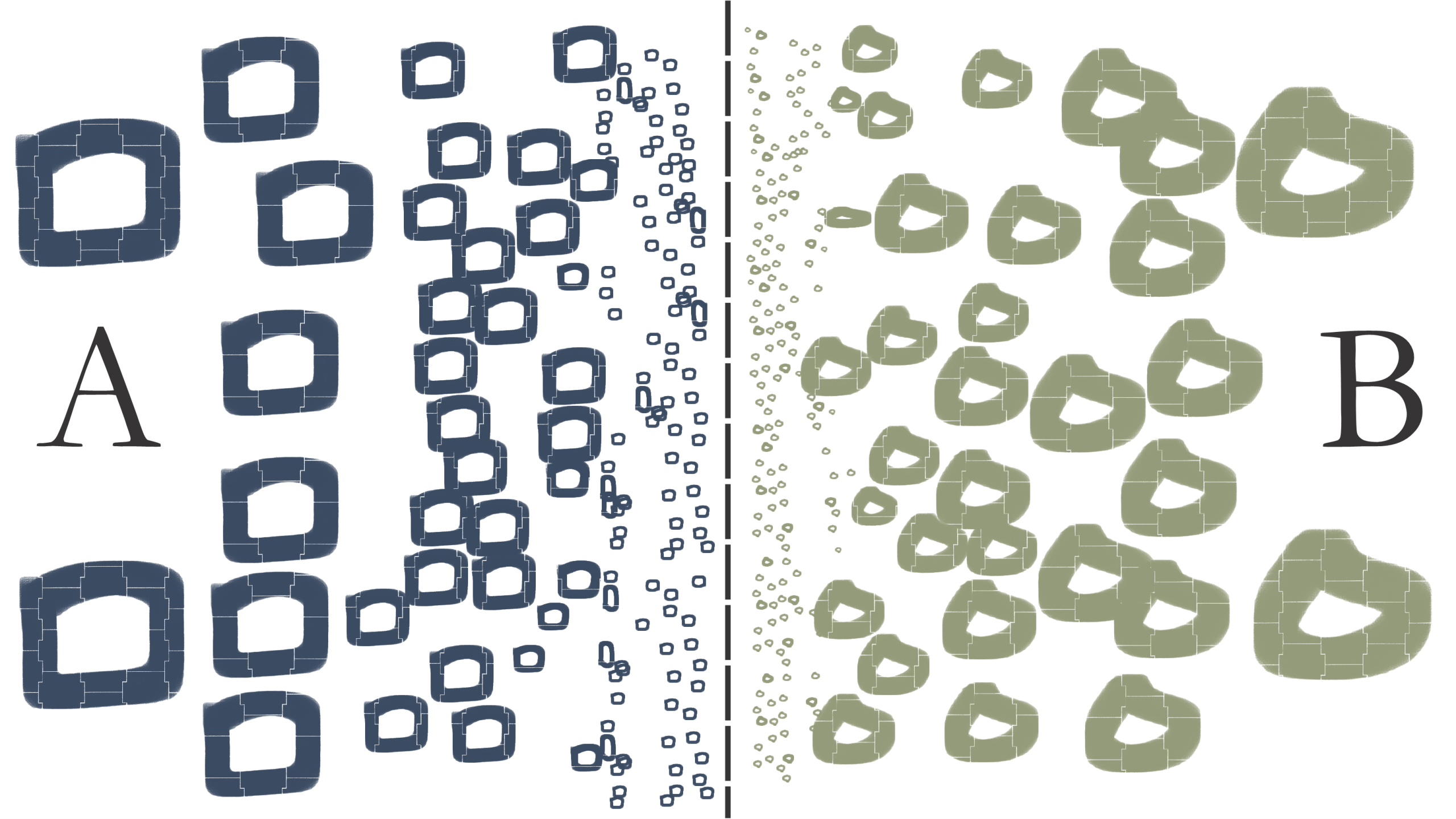 Untuk bisa mempermudah memahami saya sudah buatkan visualisasi yang menyerupai lapangan american football. Sekarang bayangkan bahwa anda yang akan menawarkan prodak baru divisualisasikan sebagai A sedangkan calon customeri adalah B. Anda dan calon pembeli berada pada dua sisi yang saling bersebrangan. Kotak – kotak menggambarkan keyakinan bahwa prodak anda layak dibeli, sedangkan lingkaran menggambarkan keyakinan calon pembeli. Semakin besar visualisasi menggambarkan semakin besar keyakinan seseorang. Pada bagian tengah merupakan daerah netral dimana kedua belah pihak tidak terlalu sensitif dengan topik tersebut.